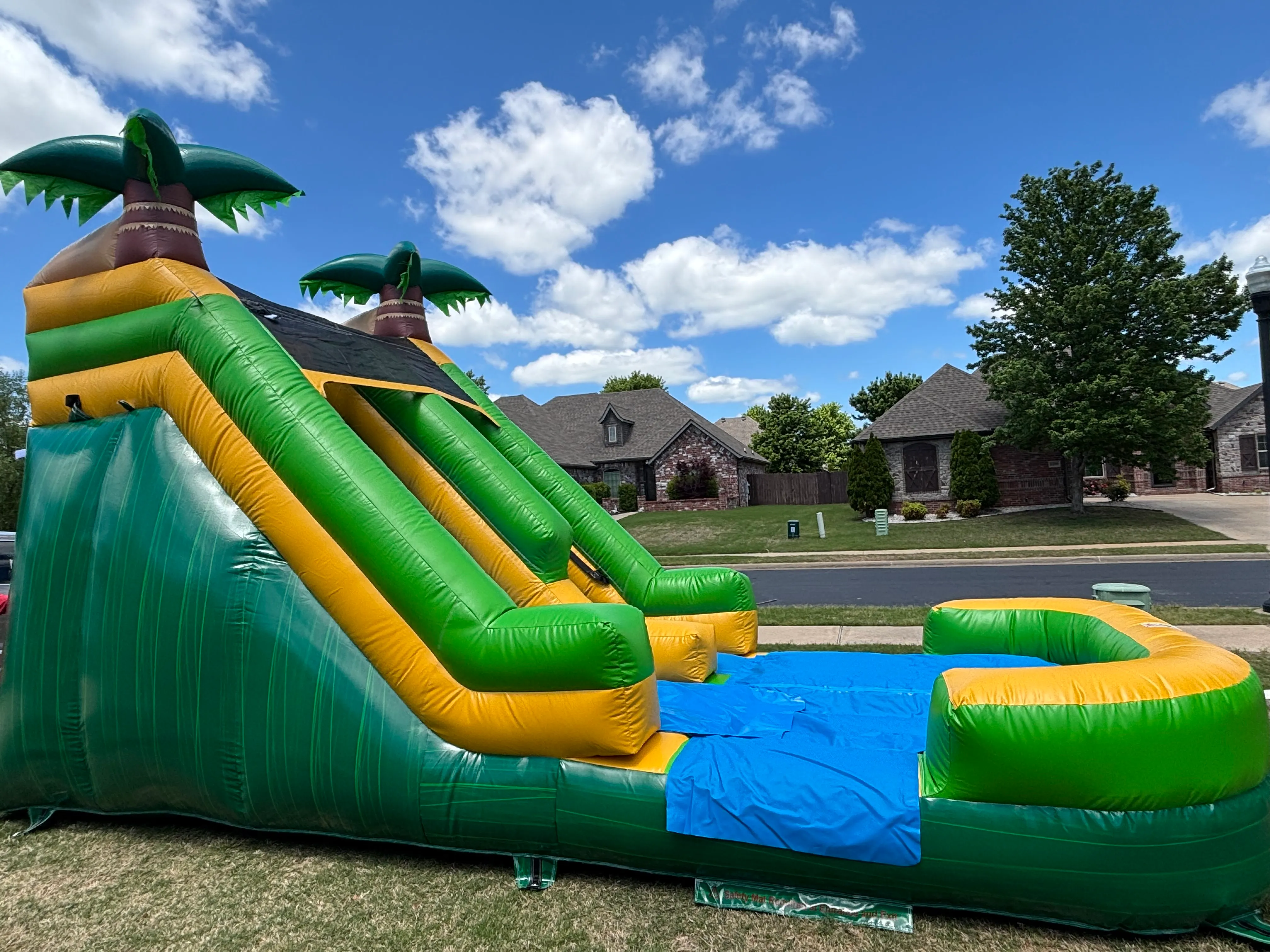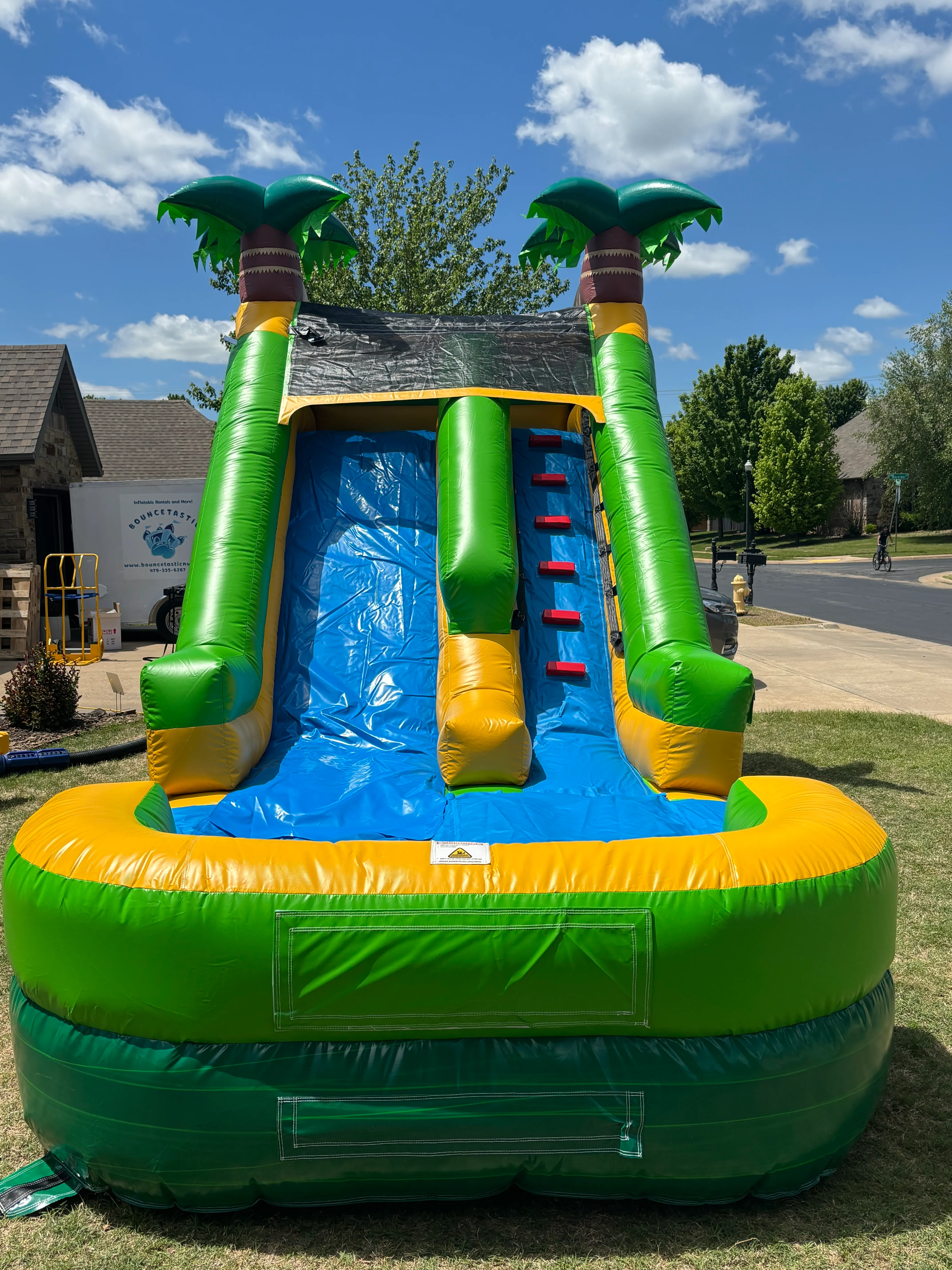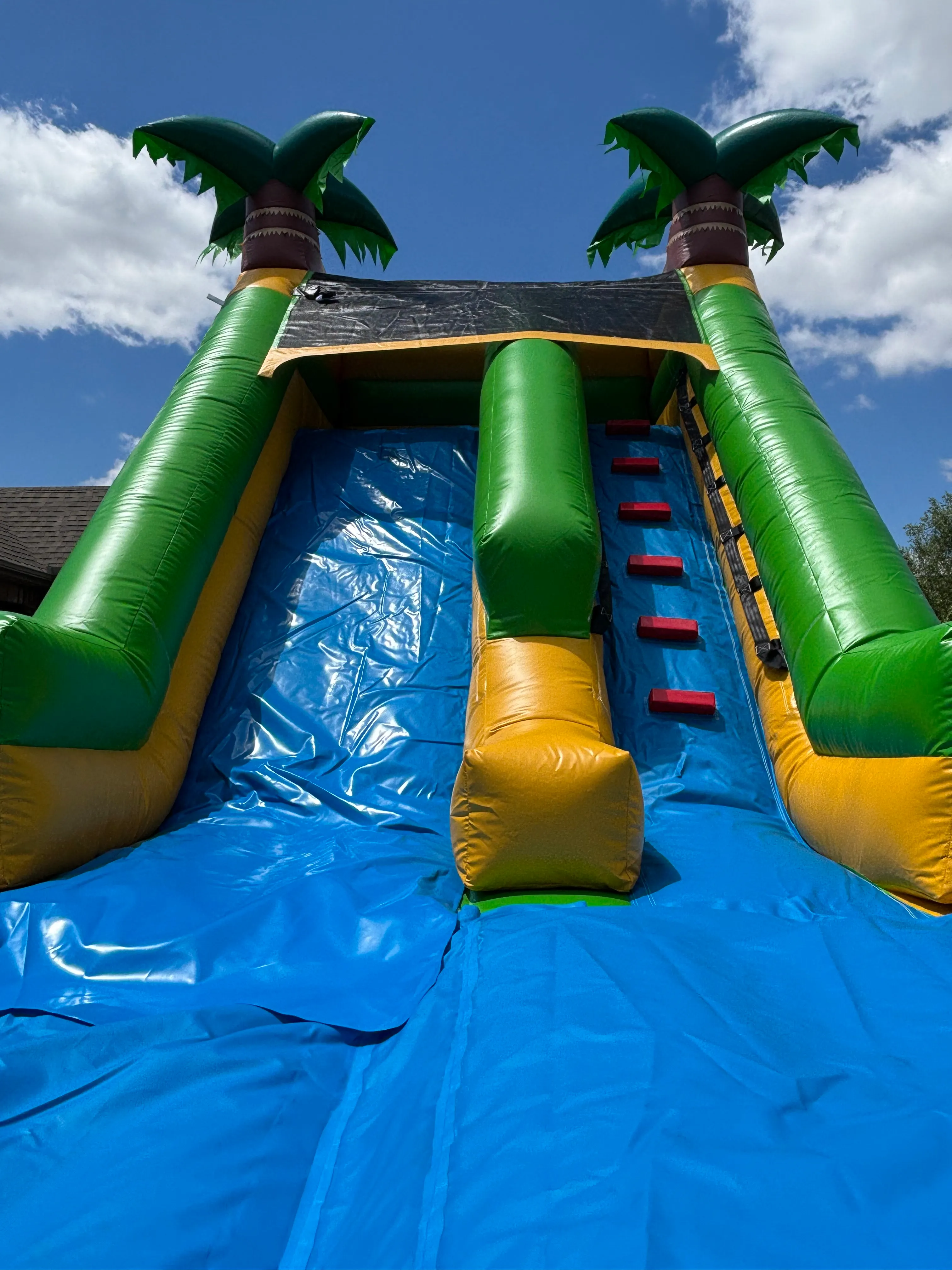 Dive into a world of tropical fun with our Palm Tree Water Slide, the ultimate addition to your next backyard bash or summer celebration! Perfect for creating unforgettable memories, this impressive inflatable slide brings the thrill of a water park right to your doorstep. Standing tall with vibrant palm trees swaying at the top, this slide promises an exhilarating ride that will have both kids and adults lining up for more. The gentle slope ensures a safe and smooth descent, while the splash pool at the bottom offers a refreshing finale to every slide. Crafted from durable, high-quality materials, our Palm Tree Water Slide is designed to withstand hours of play and excitement. Whether you're hosting a birthday party, family reunion, or just a fun weekend gathering, this water slide transforms any event into a tropical paradise. Why limit your fun to the beach when you can bring the tropics to your backyard? Rent the Palm Tree Water Slide today and make waves with an unforgettable adventure that promises laughter, joy, and endless summer vibes!