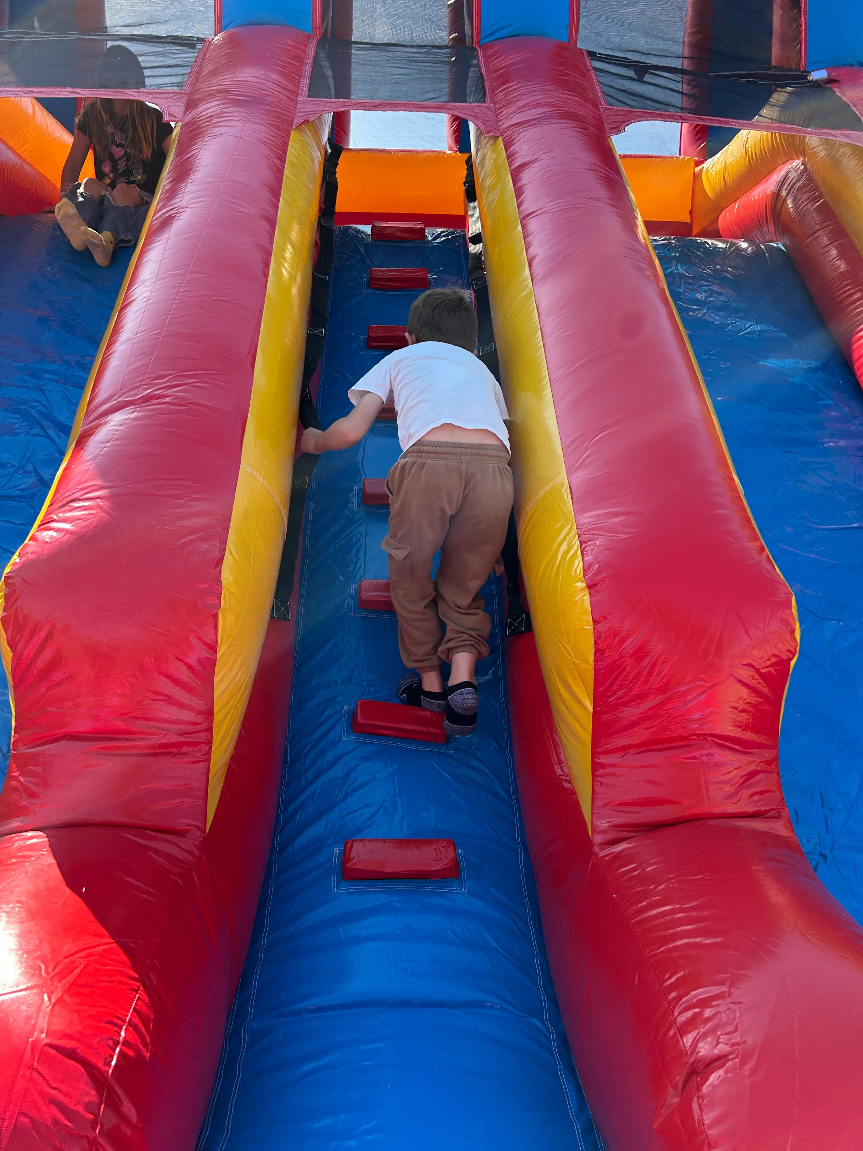 Safety nets at the top prevent any "jumpers" from getting froggy and leaping from the top. The pitch of the slide is fun but not terrifying. Individual lanes prevent collisions and injury, coupled with impact pads at the landing to prevent neck/head injury. There are stairs and hand straps to keep little hands and feet from slipping while climbing.