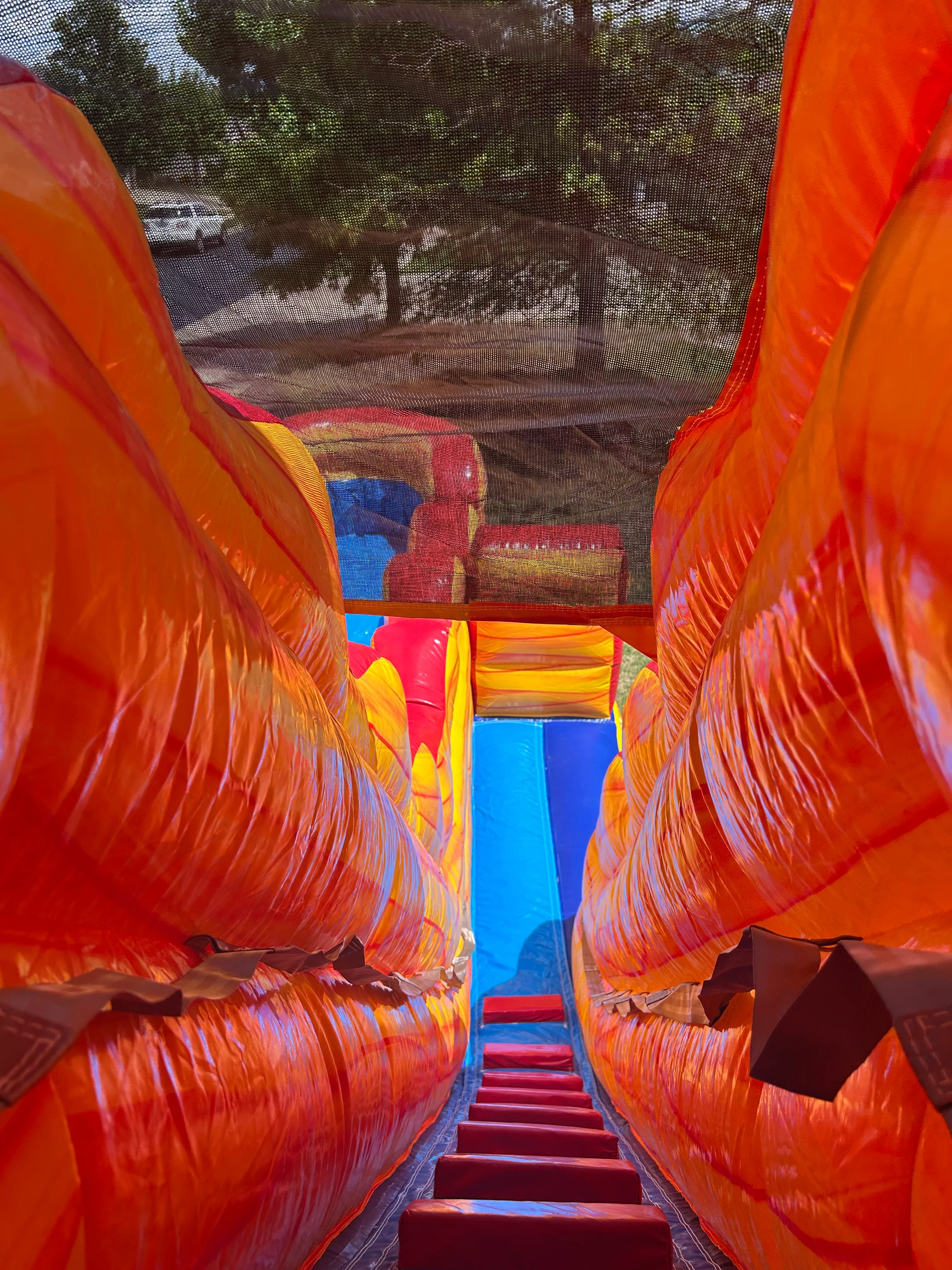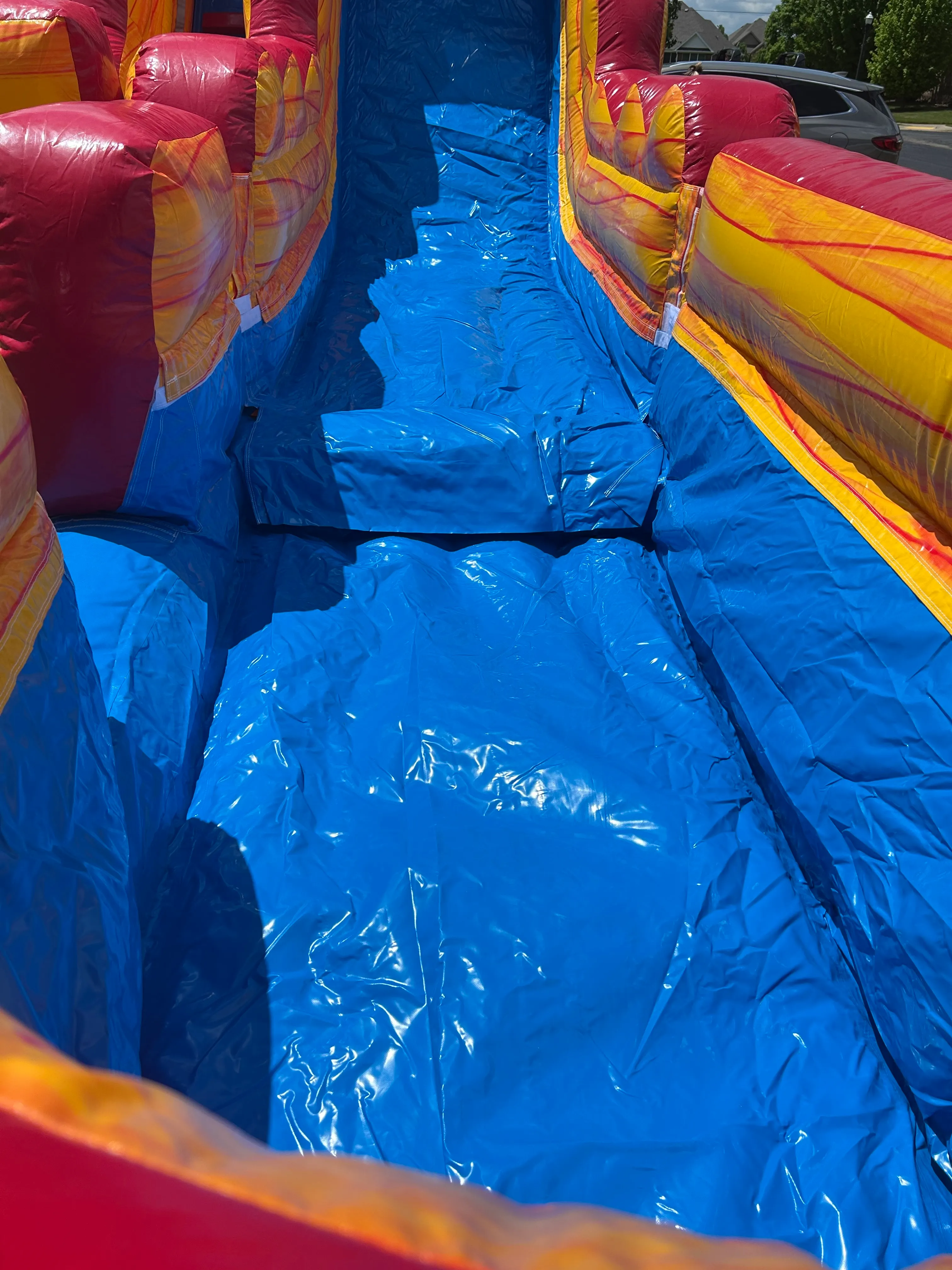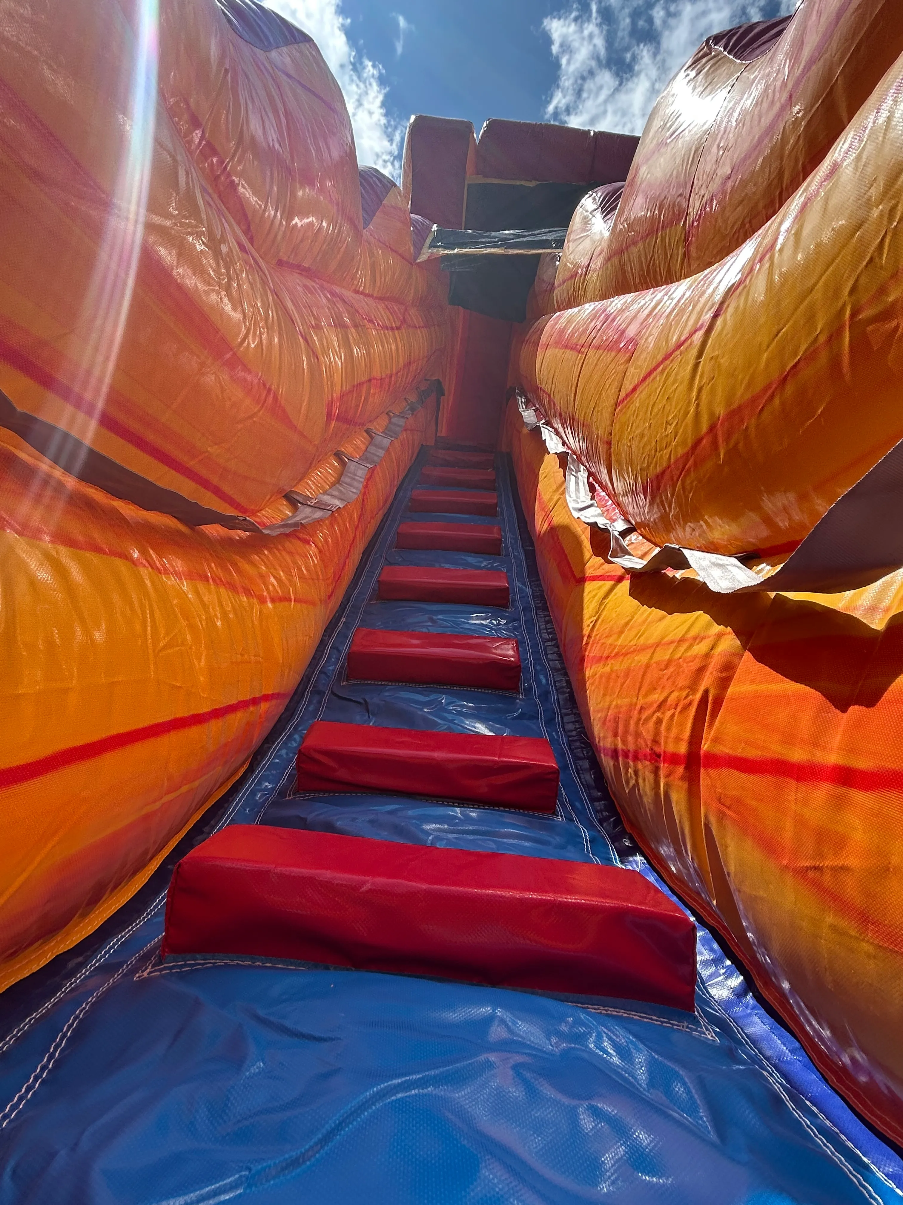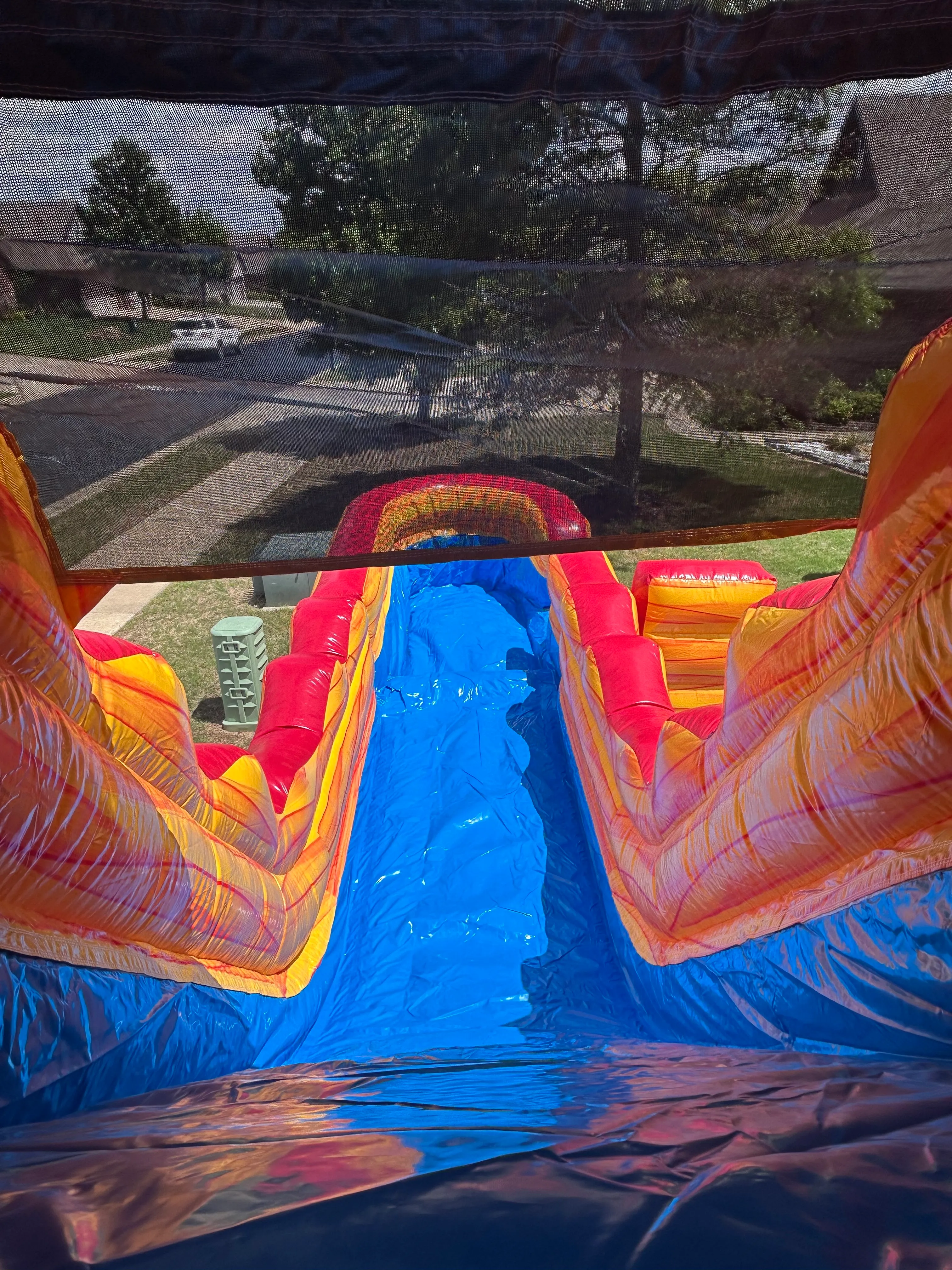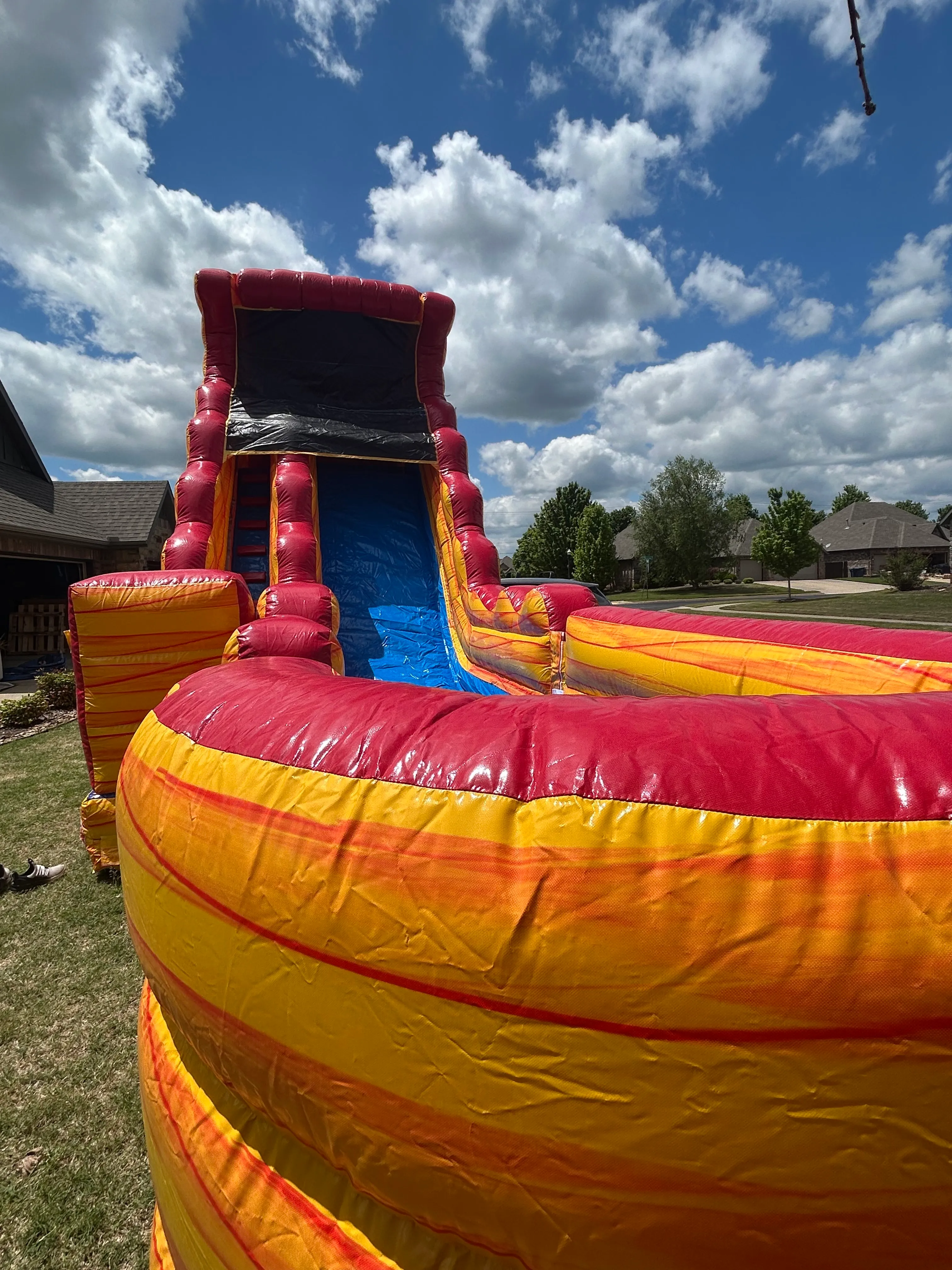 This slide is HUGE with a drop that will sure to please your adventure seekers! Even when I went up in it to take the pictures I was like "WHOA! Awesome....". This is a larger inflatable that will take up a much bigger foot print. PLEASE ENSURE YOU HAVE THE SPACE! Needless to say this is waaaayy better with water. This slide has a pool feature at the bottom adding to the end of their epic run with a huge splash!