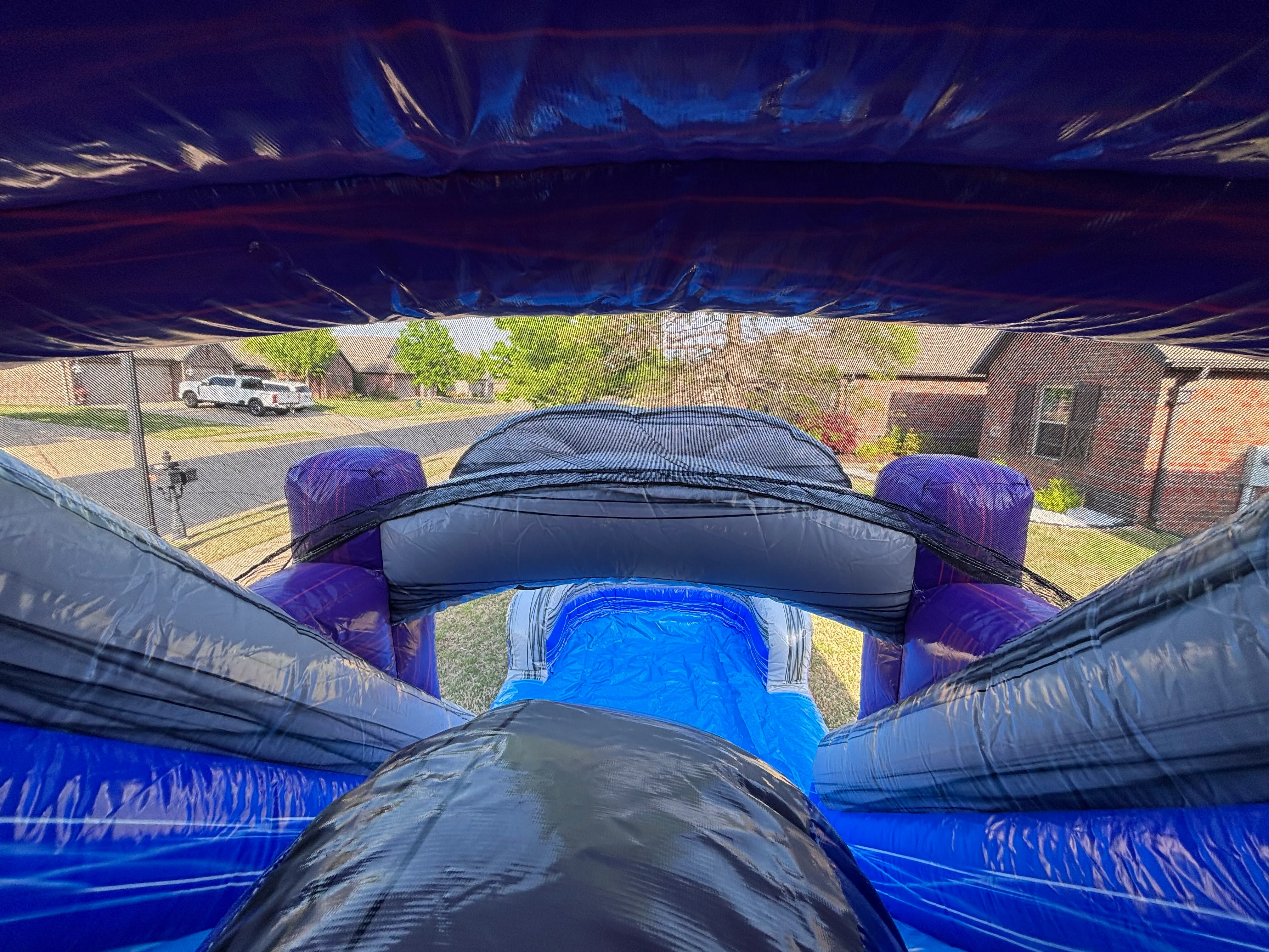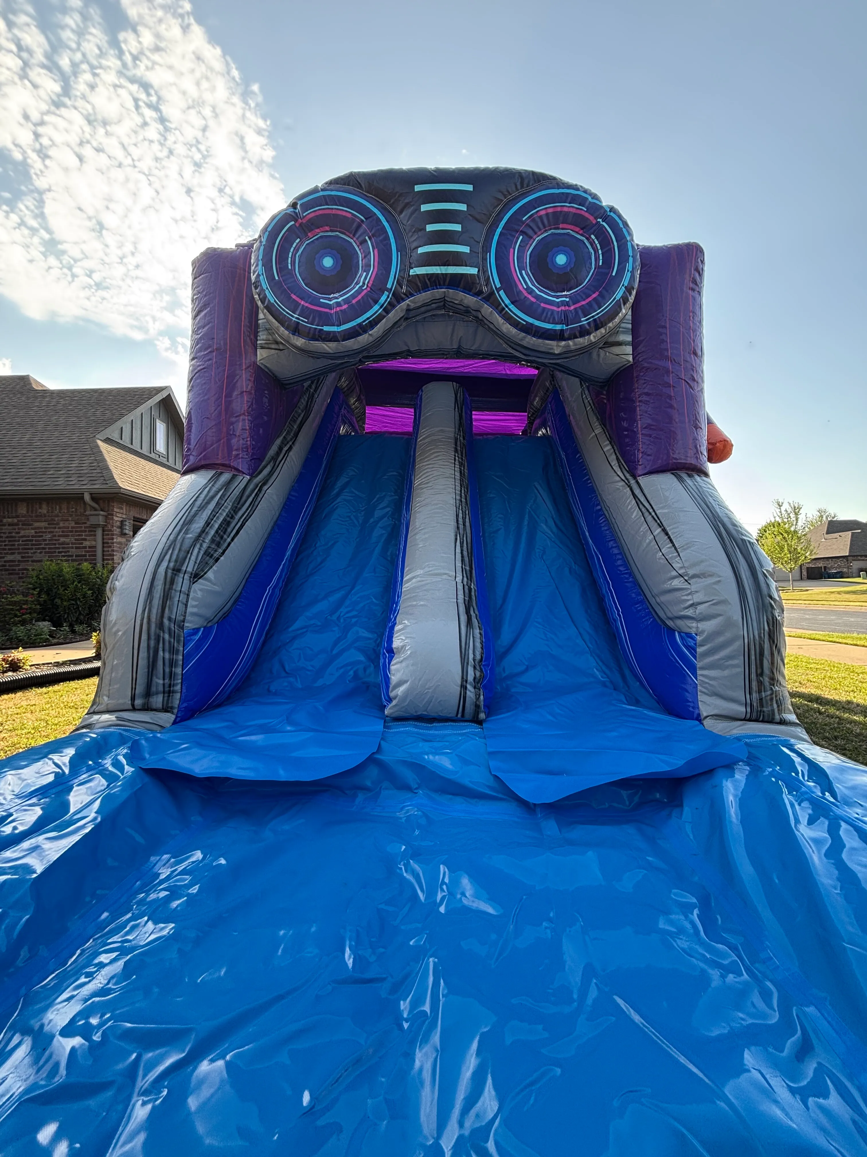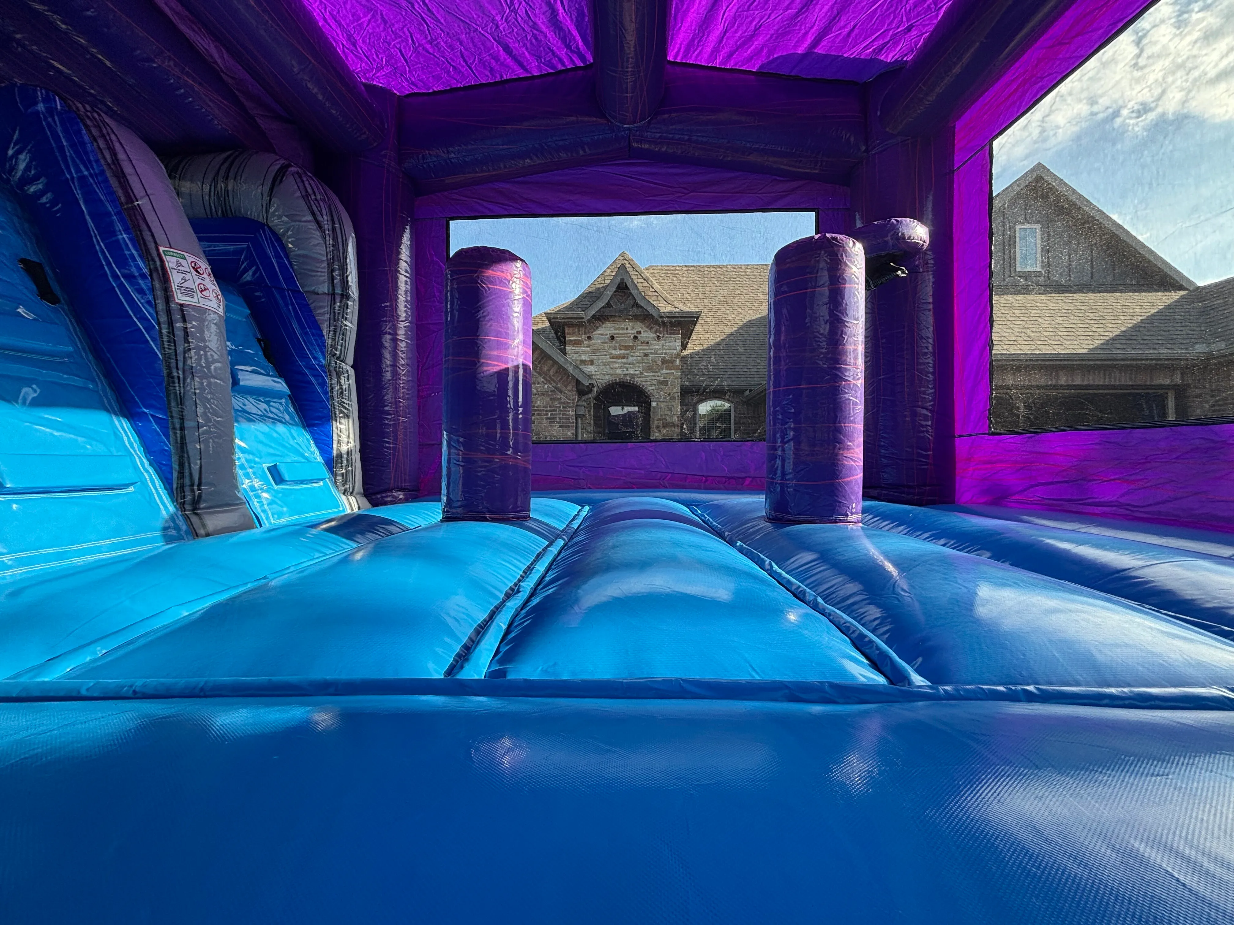 HUGE inflatable with a spacious bounce area, two independent slides, interior bumpers and B Ball hoop. Adding water slides just makes this even better! This is a fan favorite for sure, can accommodate all ages of bouncers but I will warn you, it takes up some space