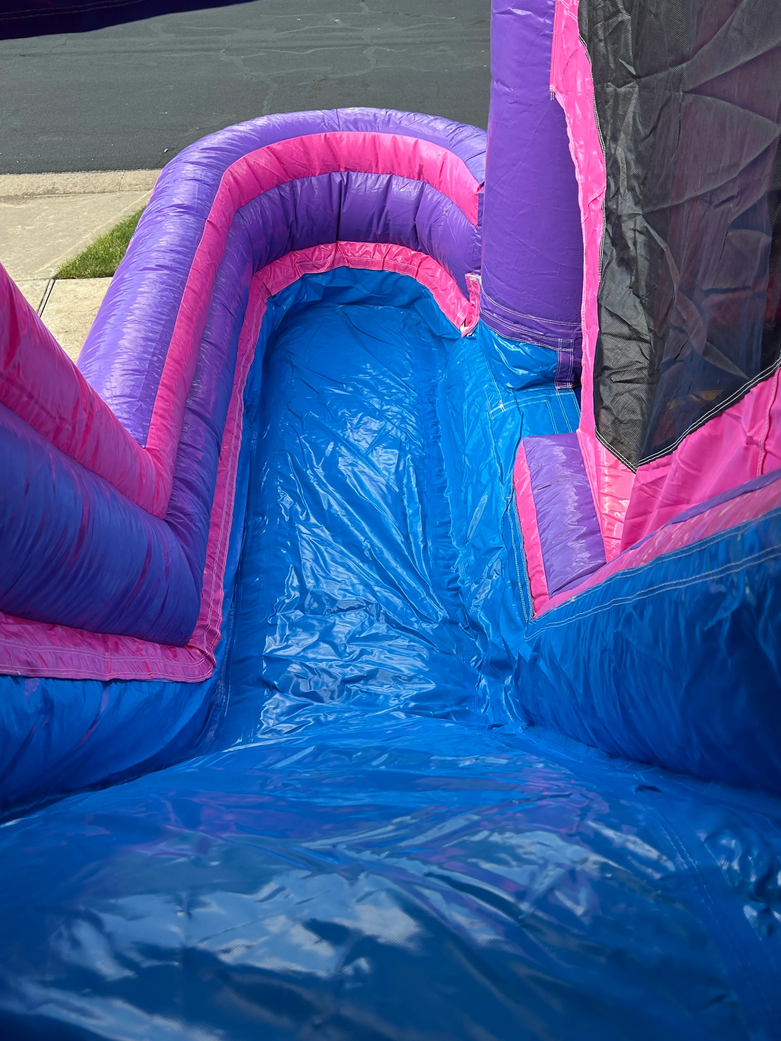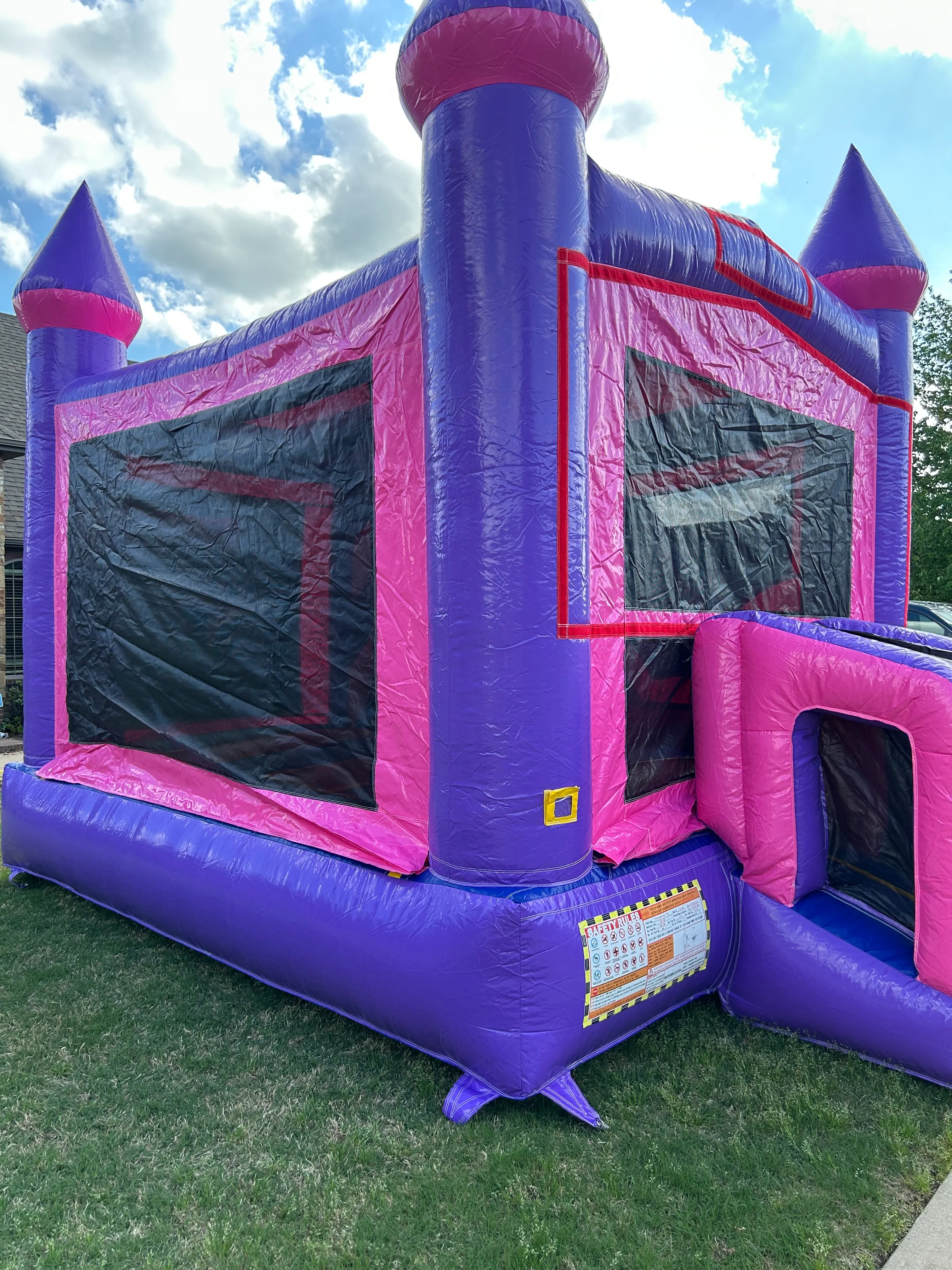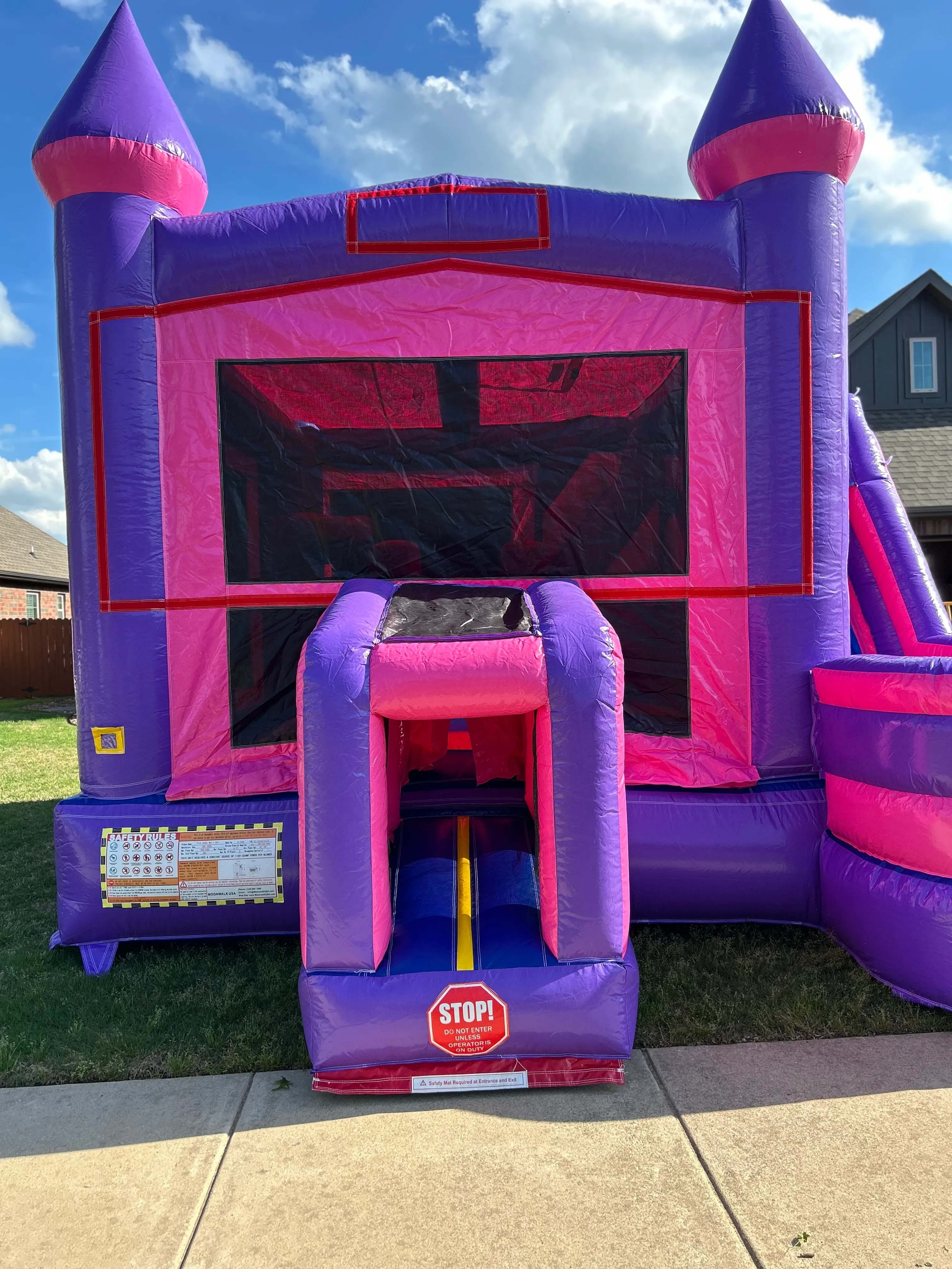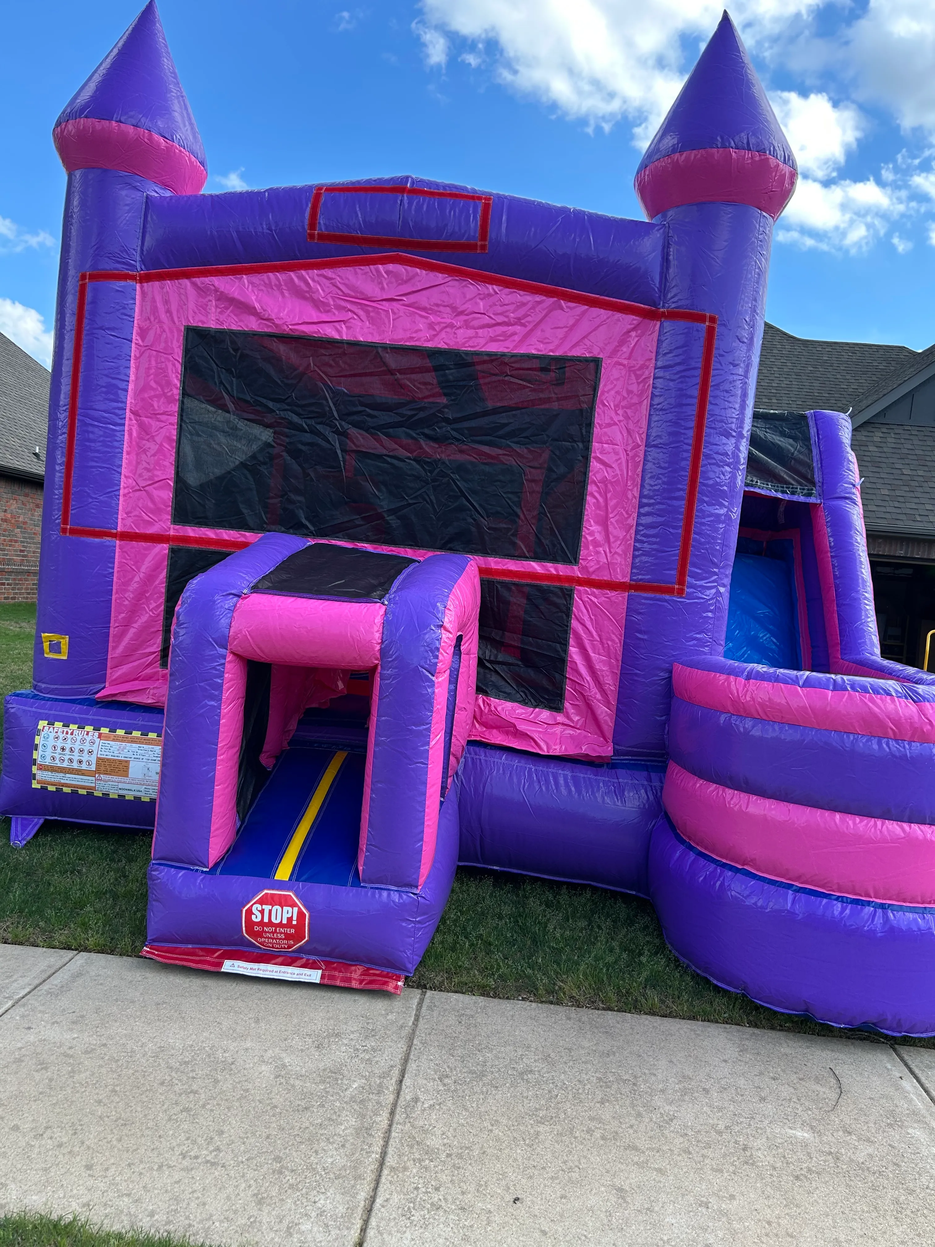 When it says castle that's just about how big it is! With a spacious bounce area, this attraction can accommodate children of all ages. The slide filters right back to the bounce area so it limits dirty feet Also, this can be equipped with water accessories to turn the the slide into a splash pool! The side entrance prevents muddy feet from attacking your yard, preventing your yard from turning into a mud pit!