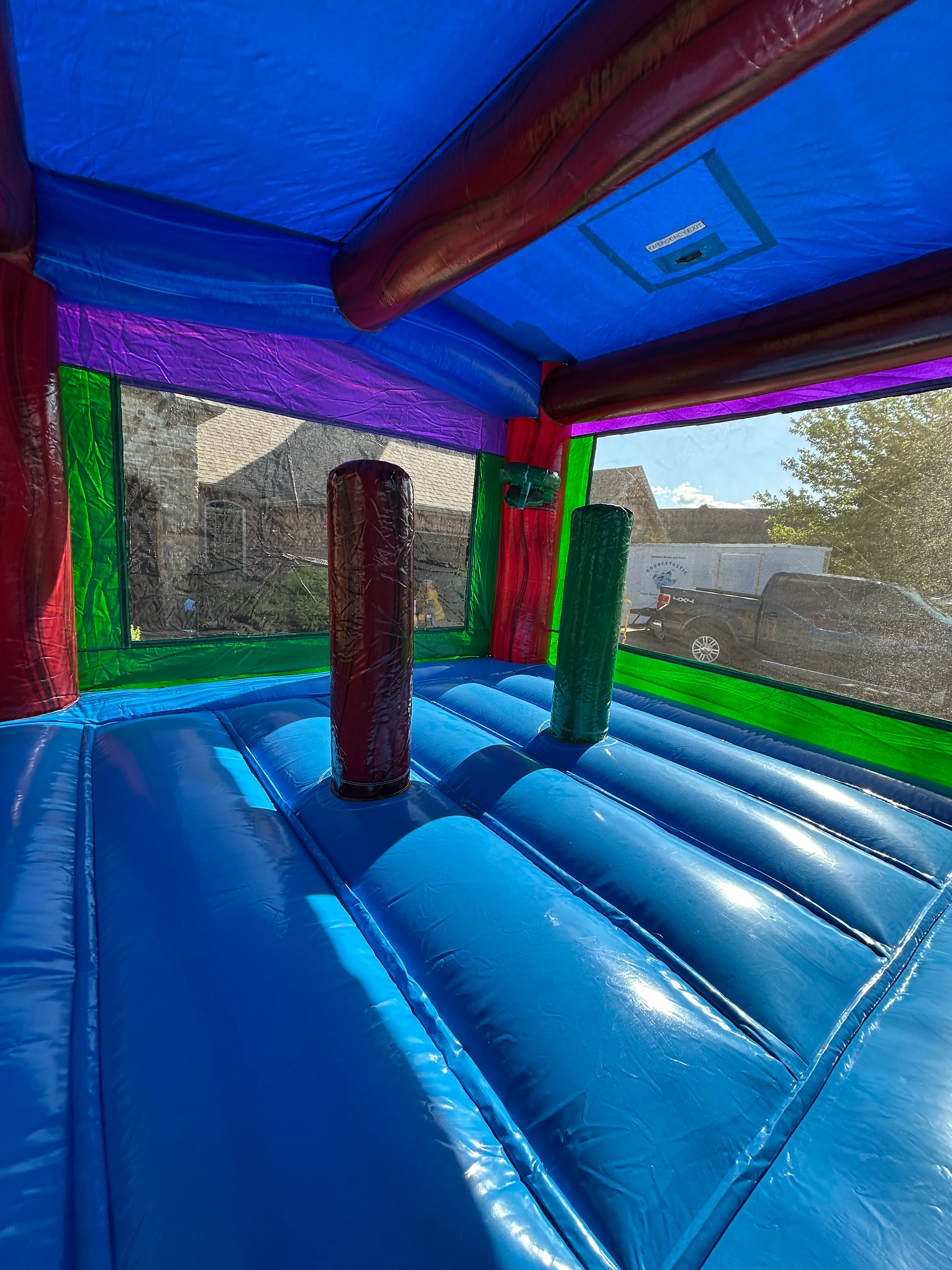 SAFETY: The side netting is very tough and will keep the jumpers jumping not falling out of the bounce house. Impact mats at the entrance and exit help prevent neck and head injuries. There is an emergency exit in the roof in case of deflation and anyone is trapped.